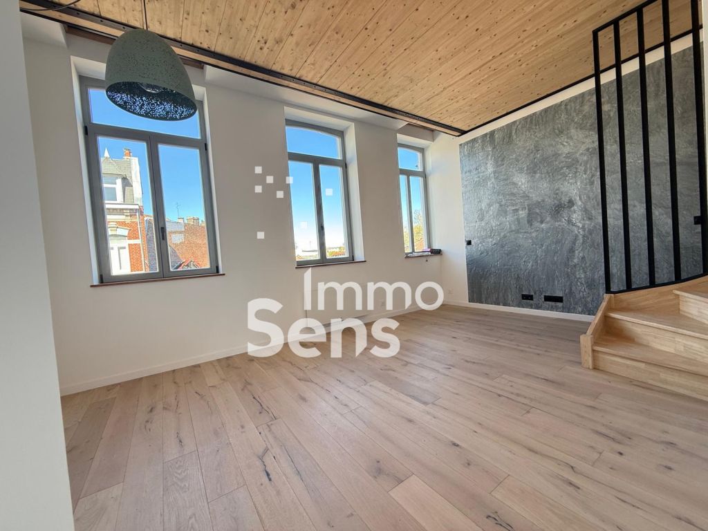 Appartement T4 en duplex situé à deux pas de la place Sébastopol , rénovation de qualité , d'une superficie de 70m2 loi carrez et d'une surface au sol totale : 81,60 m2, se composant d'un séjour parqueté luminueux , Cuisine entierement équipée , 2 chambres et un espace bureau . 2 WC , 2 salles de Bains. Grande Terrasse plein sud. Situation idéale , à 5min du métro république et du marché de wazemmes.